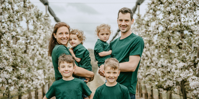 Lisa Gunßer, gelernte Logopädin und Erzieherin, Sven Gunßer, Obstbaumeister mit Hannes, Josef und den Zwillingen Charlotte und Julia. Mit unserem Hofladen wollen wir die Vielfalt der regionalen Produkte hervorheben und die Möglichkeit bieten, dort zu kaufen, wo’s wächst.